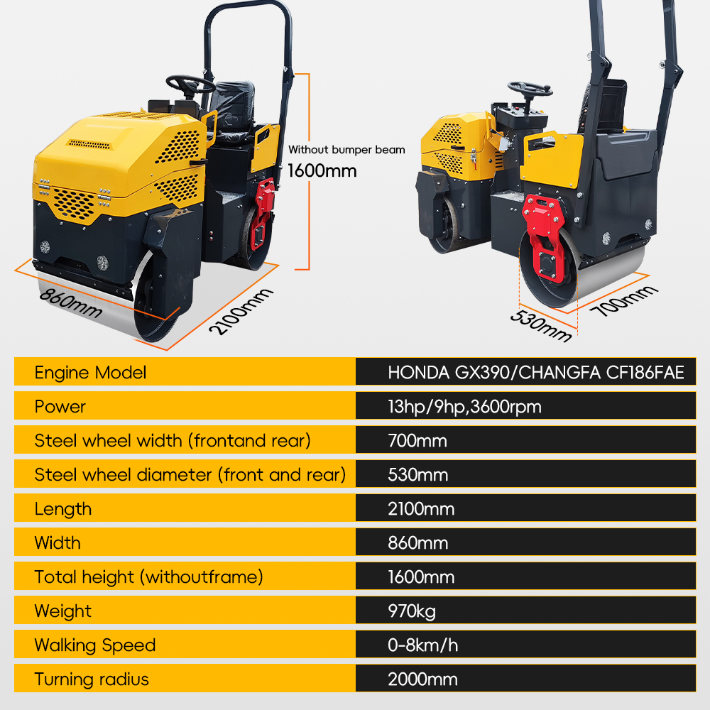 Ce rouleau compresseur entièrement hydraulique de 1 tonne est équipé d'un moteur Honda GX390 de première qualité d'une puissance de 13 ch/3600 tr/min pour un fonctionnement puissant mais économe en carburant et une distribution supérieure de la chaleur. Dites adieu aux vibrations grinçantes, savourez un fonctionnement sans faille et anticipez sa longévité.