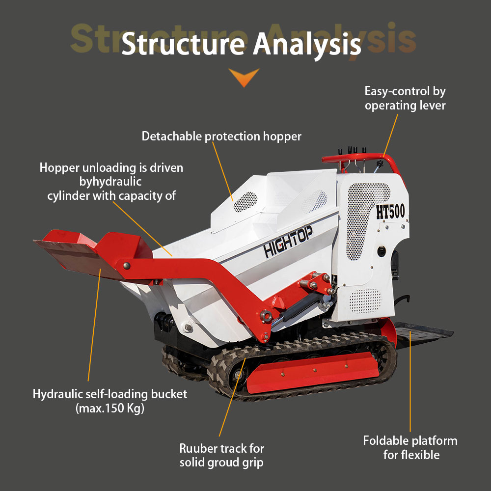 Le Mini Crawler Dumper Hightop est équipé d'un moteur Briggs&Stratton haut de gamme d'une puissance allant jusqu'à 4,2KW/3600rpm pour un fonctionnement puissant mais économe en carburant et une distribution de chaleur supérieure.