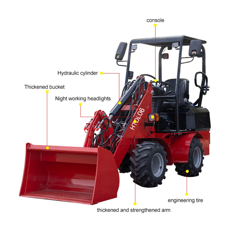 La chargeuse sur pneus HTDL06 est une machine de construction très performante avec une capacité de charge de 600 kg, ce qui permet à la chargeuse sur pneus Hightop de jouer un rôle important dans un large éventail de projets, qu'il s'agisse de projets de terrassement à grande échelle ou de petits projets de construction.